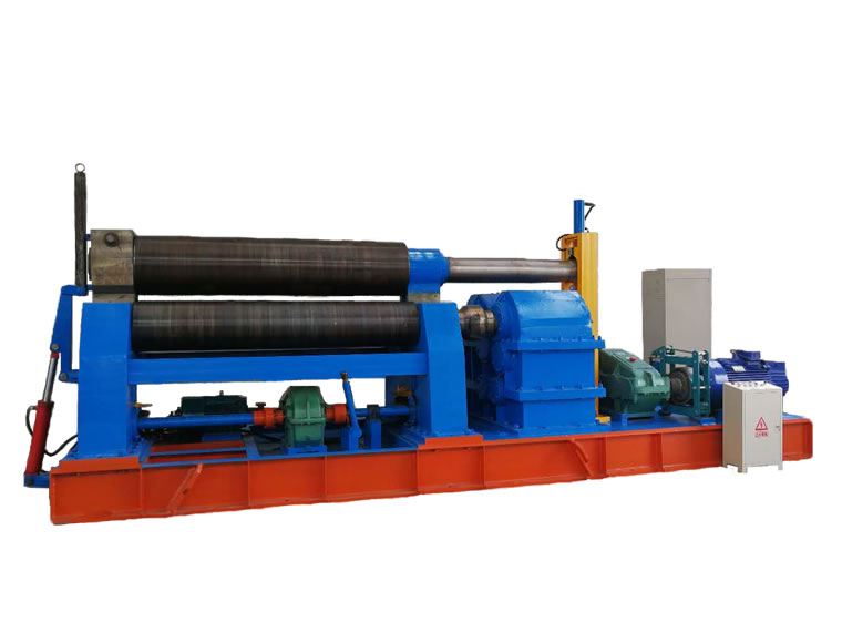 本機為對稱式三輥卷板機,兩下輥為主動固定輥,上輥通過升降絲桿、渦輪、蝸桿在兩下輥對稱中央作上下移動,兩下輥的正、反旋轉和上輥的升降移動均靠電機帶動減速器來完成,并能借助手動離合器把上輥調節成平行或傾斜位置,以適應卷制圓形和錐形工件的需要;并設有液壓倒頭翻轉和液壓壓緊上桿裝置,由電器控制,取代了一般人工倒頭和人工壓緊上桿的操作方法;渦輪上下配有特種壓力軸承,轉動輕松、省電耐磨。該機設計先進、自動化程度高,全電控操作,使用方便、省時、省力。